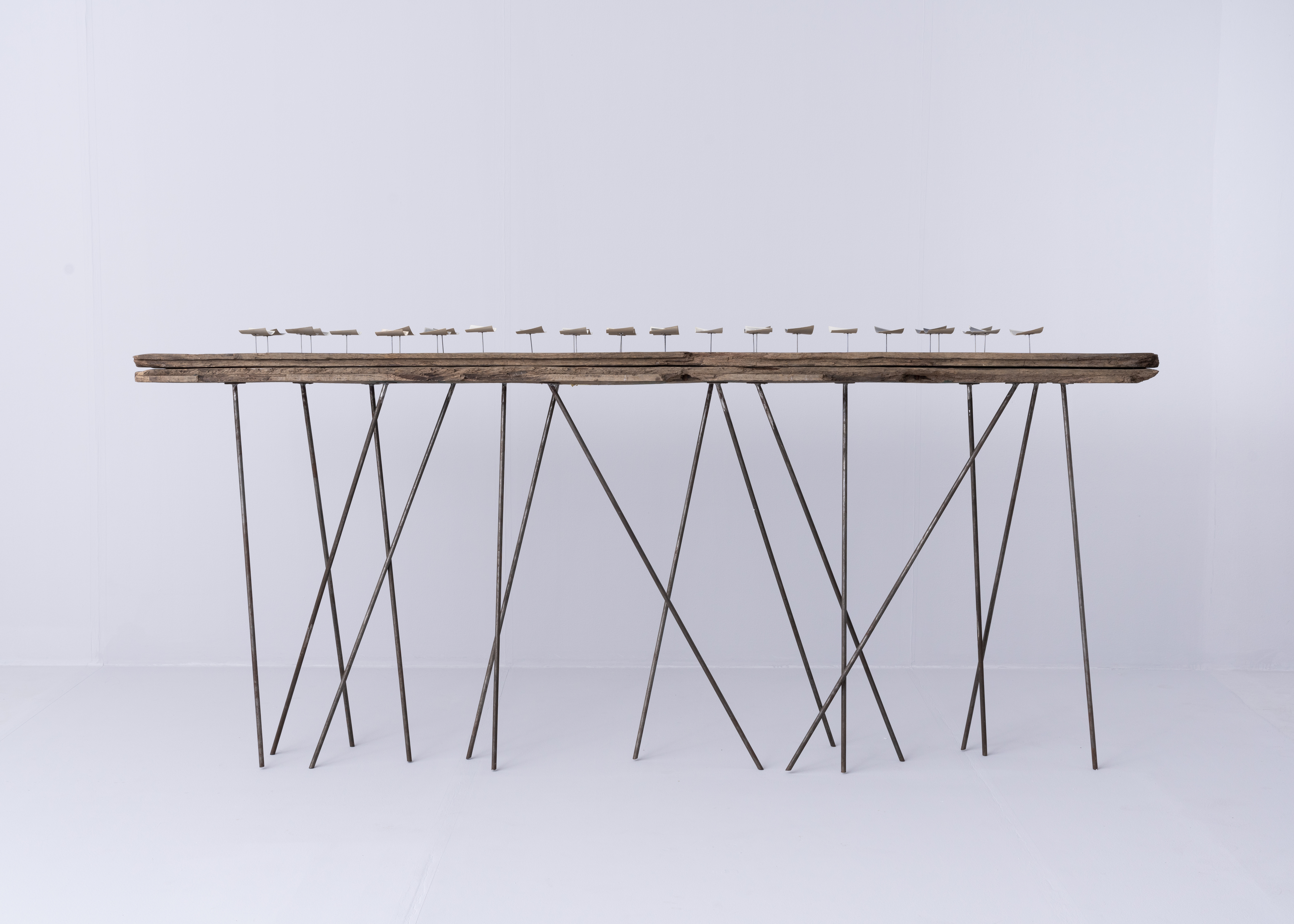 In these photographs, we see a man-made structure, geometric, brutal and monumental in scale, standing tall against the forces of vigorous currents of the Jamuna river that race down on the horizontal plane, amidst soft and fragile elements of nature. Bringing forward this juxtaposition of a horizontal and vertical axis, Munem Wasif’s image based installation discloses a contradictory tale of climate, life, nature, and development.