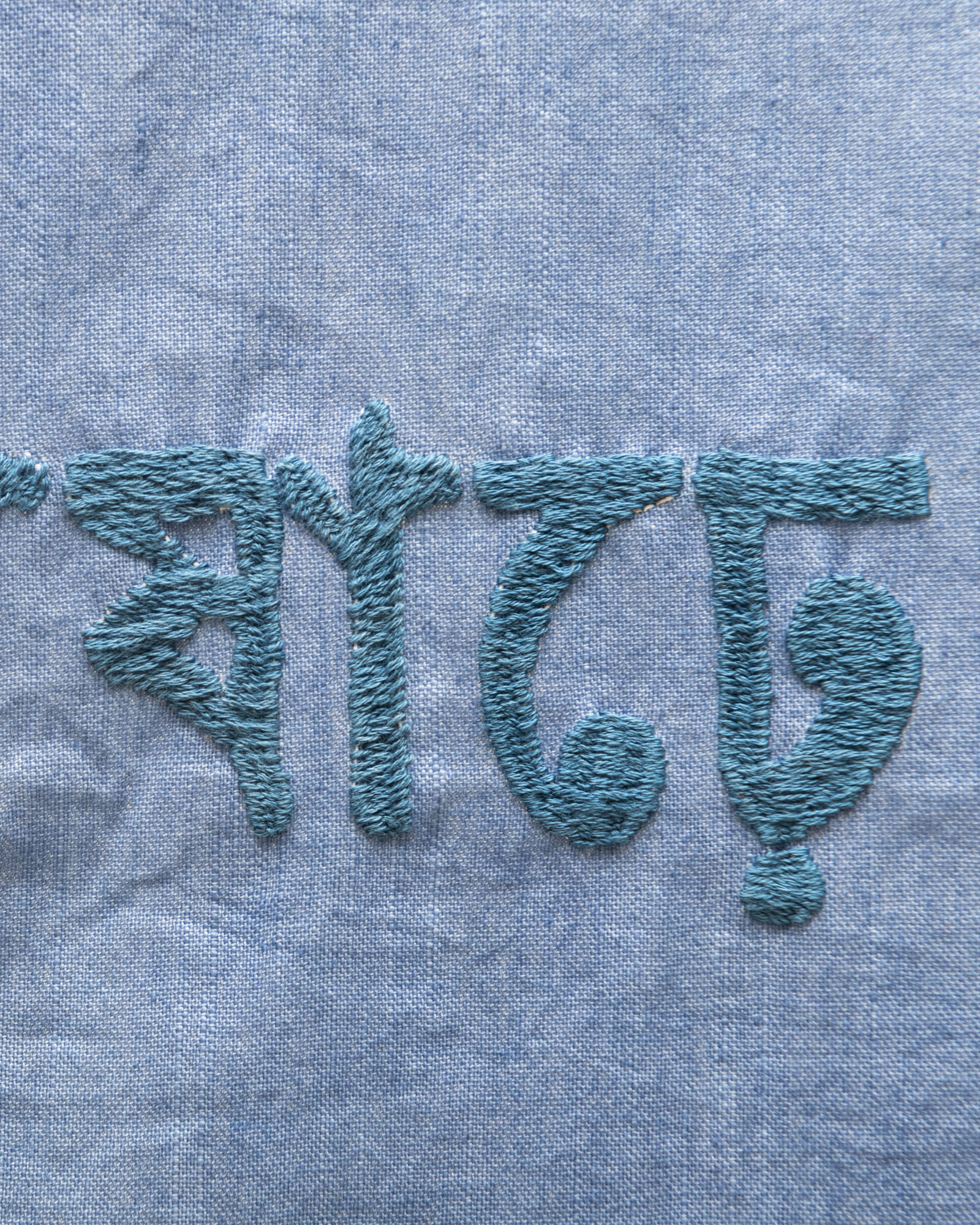 Hand-stitched text with wooden and steel hanging system